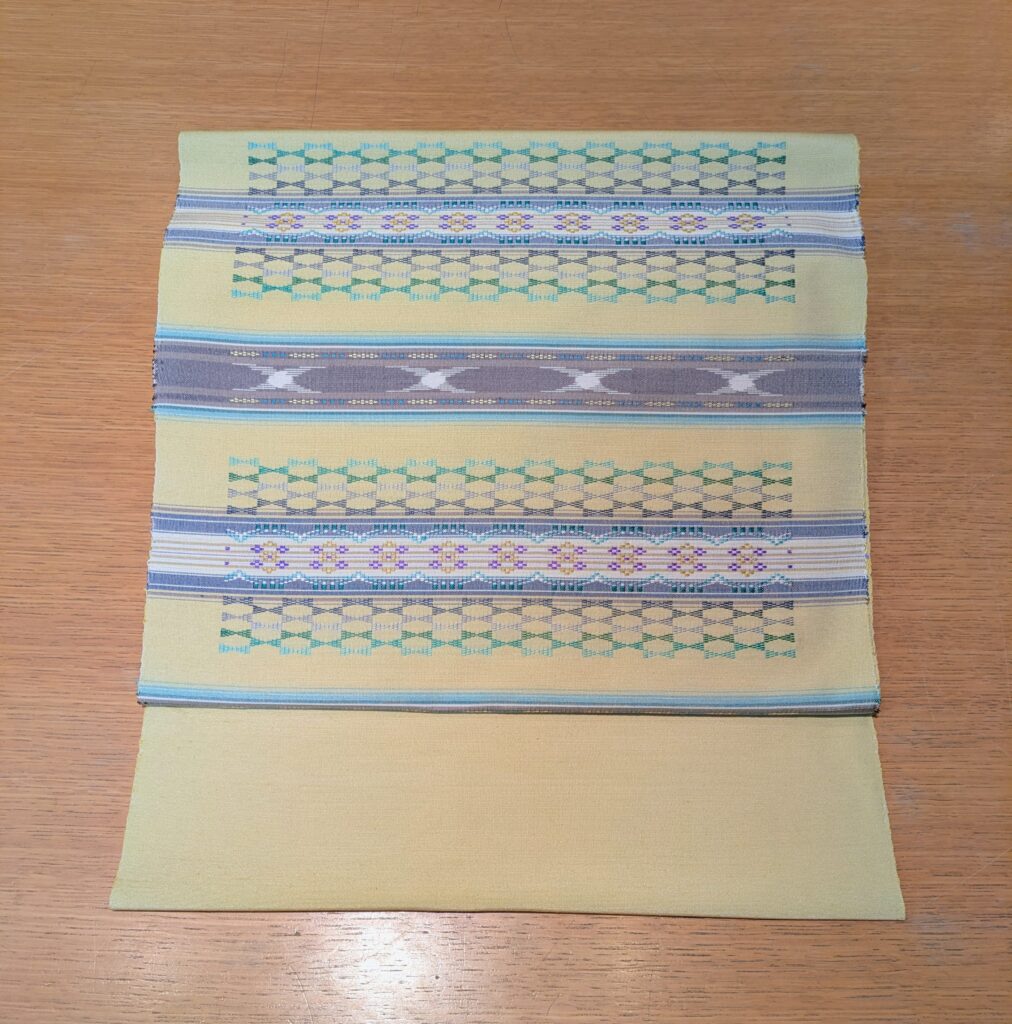鮮やかなレモンイエロー地色に綺麗な配色の花織、とてもCUTE❤️な帯です。